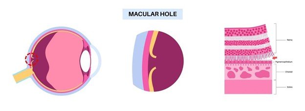 Age-related vitreous changes, high myopia, eye injury, retinal detachment, or chronic macular oedema can all contribute to hole formation.