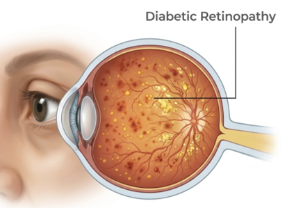 Diabetic retinopathy is an eye condition caused by damage to the blood vessels in the retina due to high blood sugar levels. Over time, excess glucose can block these small vessels, reducing the retina’s blood supply. In response, the eye may form new blood vessels, but these are usually fragile and abnormal, often leading to leakage and vision problems.