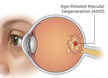 Age-related macular degeneration (AMD) is a common eye condition that affects the central part of vision, making it difficult to see fine details clearly. It most commonly occurs in people over the age of 50.